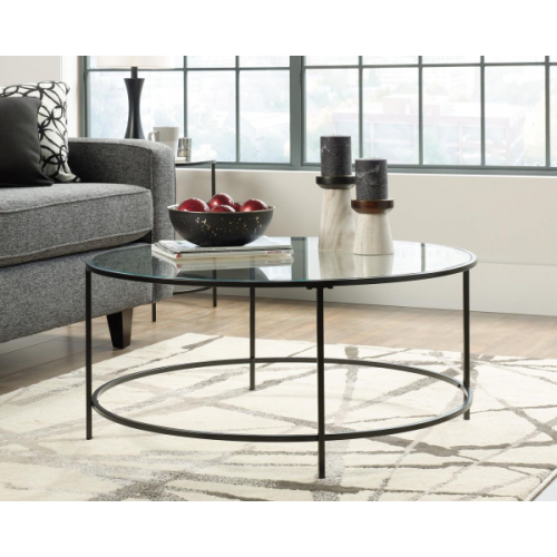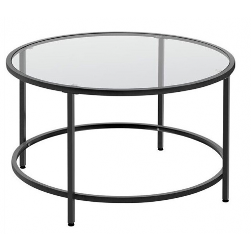 - Circular coffee table with glass top and black metal frame