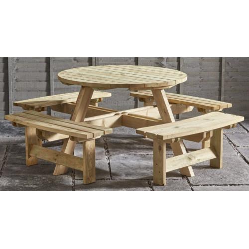 Round timber picnic bench that will comfortably seat 8 people.